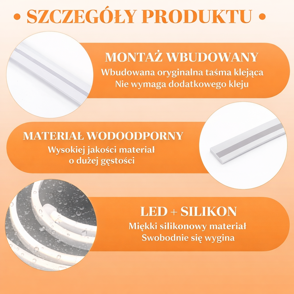 Estetyka Premium: Połączenie miękkiego silikonu i PVC sprawia, że taśma jest niemal niewidoczna po montażu, a emitowane światło jest idealnie rozproszone – bez efektu "punktowych diod".